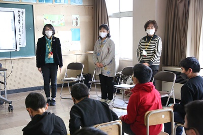 次に,人権擁護委員さんの劇を見て,「ちくちく言葉」や「ふわふわ言葉」について学びました。どんな言葉を使って会話をすると相手がよい気持ちになるのかを考えて話すことが大切であることを学びました。