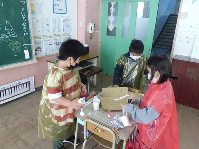 1・2年生の生活科の学習で「秋祭り」を行いました。松ぼっくりなどの秋の木の実を使って遊び道具を作ったり,魚釣りや的を狙って入れる遊びのコーナーを企画したり,マラカスやこまを作って遊んだりしました。また,おみこしを作り,それを担いで校内を練り歩きました。