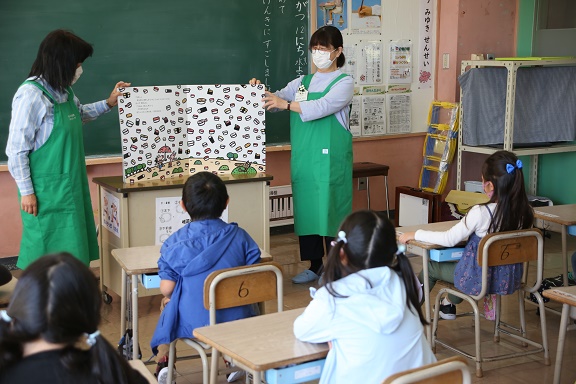 白石市図書館読み聞かせボランティアの道山さんが,越河地区に残る「安産ダルマ像」や約300年前の「弁才天像」について写真で紹介してくださいました。また,絵本の読み聞かせや,紙芝居もしてくださいました。子供たちは地元の史跡に反応し,「知ってるよ」とか「みんなで見に行ったよ」と答えていました。